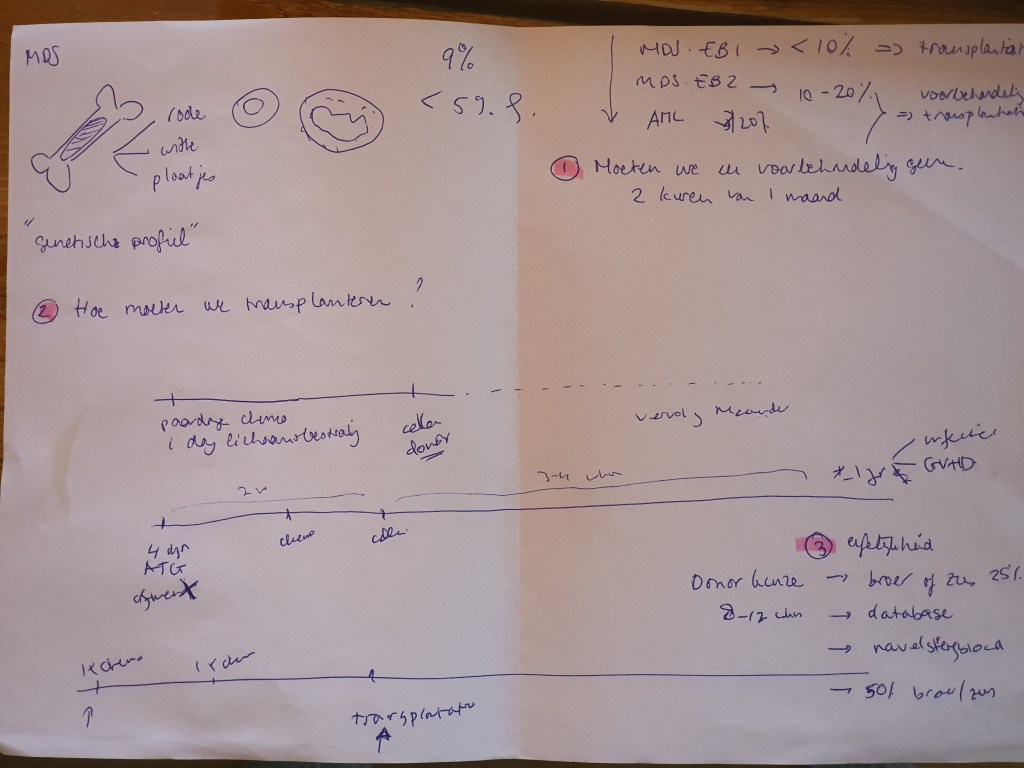 In de opleiding van de bloeddoktoren zit blijkbaar een tekencursus want ook dokter Myelody tekende de verschillende scenario’s net zoals dokter Bloed dit eerder had gedaan. En daar waar dokter Bloed de focus op empathie had lag de focus van Myelody op duidelijk en concreet. Het zou een zwaar traject worden, maar eentje waar zij haar hand niet voor om zou draaien. Voor mij als patiënt was het eigenlijk wel prettig. Cut the crapp! De grootste uitdaging zou echter worden dat er een goede stamceldonor gevonden moest worden. Dat zou nog een aanzienlijke periode duren.