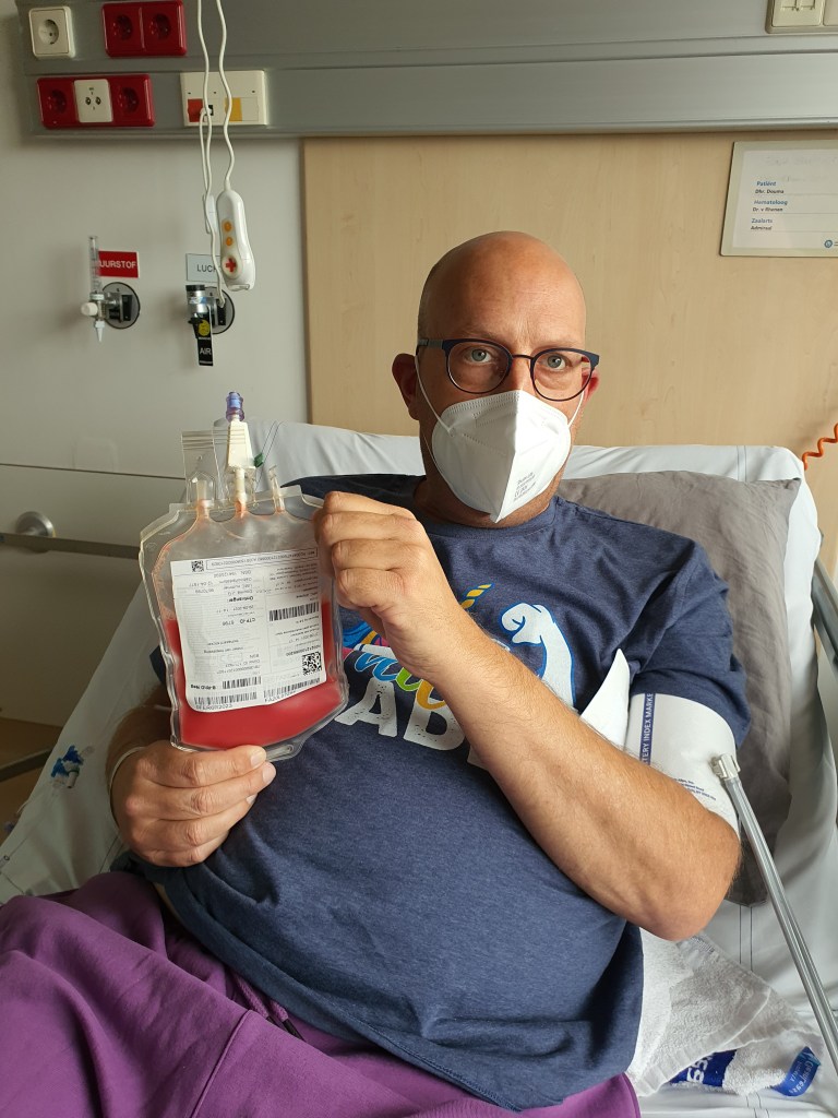 Ik heb weken in een bubbel geleefd. Ik woonde op kamer 20 en heb me ziek gevoeld. Ik heb hoge koorts gehad en reacties op medicatie die, op z’n zachtst gezegd, opmerkelijk waren. Een medicijn zorgde ervoor dat ik alle voorwerpen omringd zag door neon kleuren en mijn zicht was alsof Ziggo de kabel net niet helemaal goed had aangesloten. Dat was best eng en angstaanjagend. Gelukkig verdwenen de effecten nadat het medicijn gestopt is. Totaal van de wereld zijn door koorts en/of medicatie. Een Captain Chemo afgeladen met zakken waarop enge stickers geplakt waren om uiteindelijk een klein lullig zakje bloed te krijgen waarin nieuwe stamcellen zaten. Een half uurtje en de transplantatie was gepiept. The point of no return. Er zitten nu cellen in mijn lijf van iemand anders die hopelijk mijn Leukemie cellen kapot hebben gemaakt. Cellen van iemand die zich weken heeft voorbereid om uiteindelijk een lullig zakje bloed te produceren waarmee ik hopelijk nog wat jaren mee kan. Ik ben ziek geweest, maar de donor heeft ook echt wat stappen bij moeten zetten om mij te helpen. Waarvoor dankbaarheid en respect.